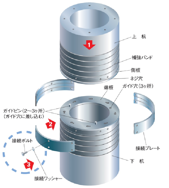 T・P JOINTは、端板、側板、補強バンド、接続プレートおよび接続ボルトから構成されています。杭本体の継手金具は、端板、側板、および補強バンドからなり、側板に接続プレートのボルト孔に対応したねじ穴が切られています。