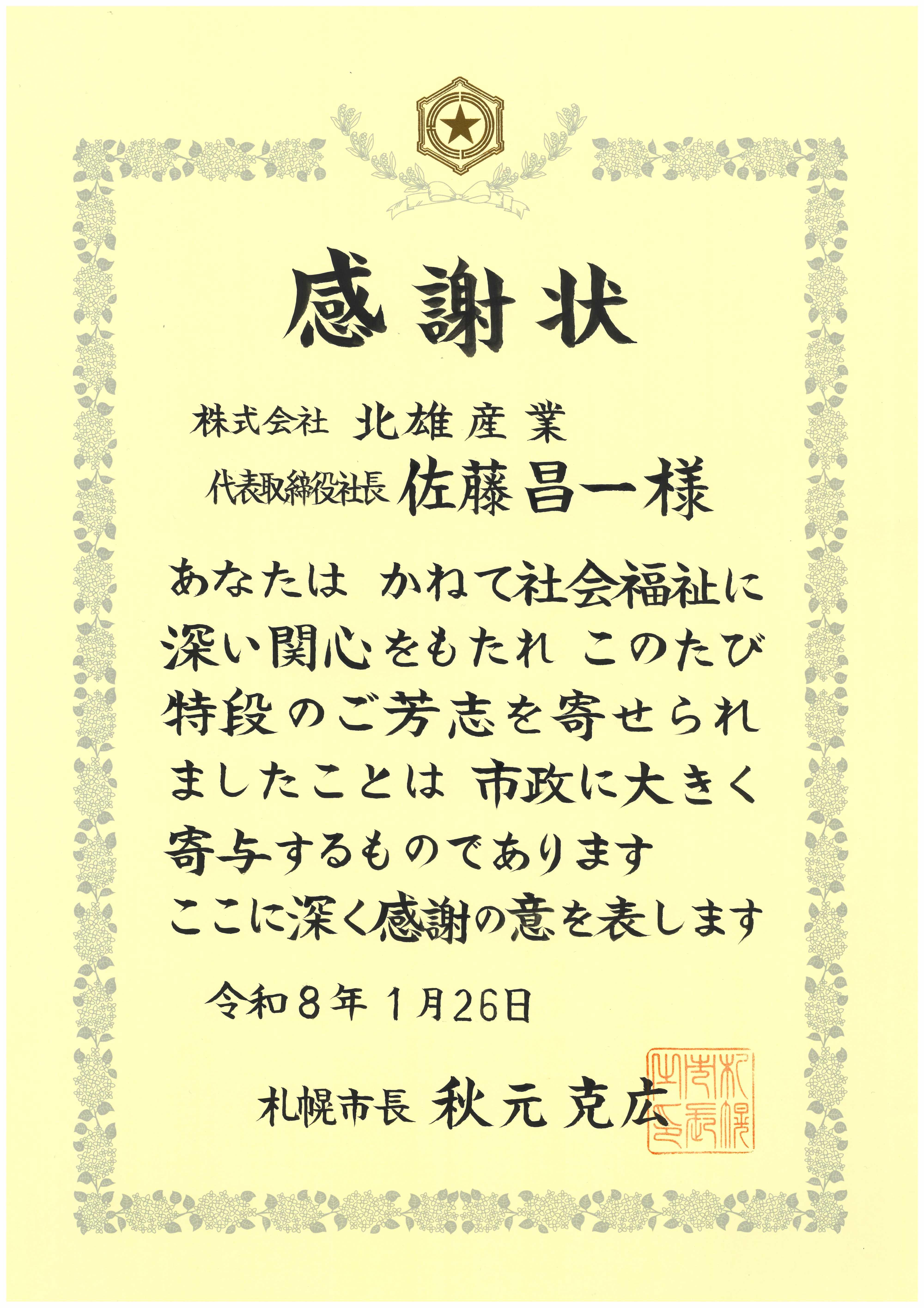 このたび当社社長の佐藤昌一が「豊平区内の母子家庭のために」と図書カードを寄付したことに対し、札幌市から感謝状をいただきました。