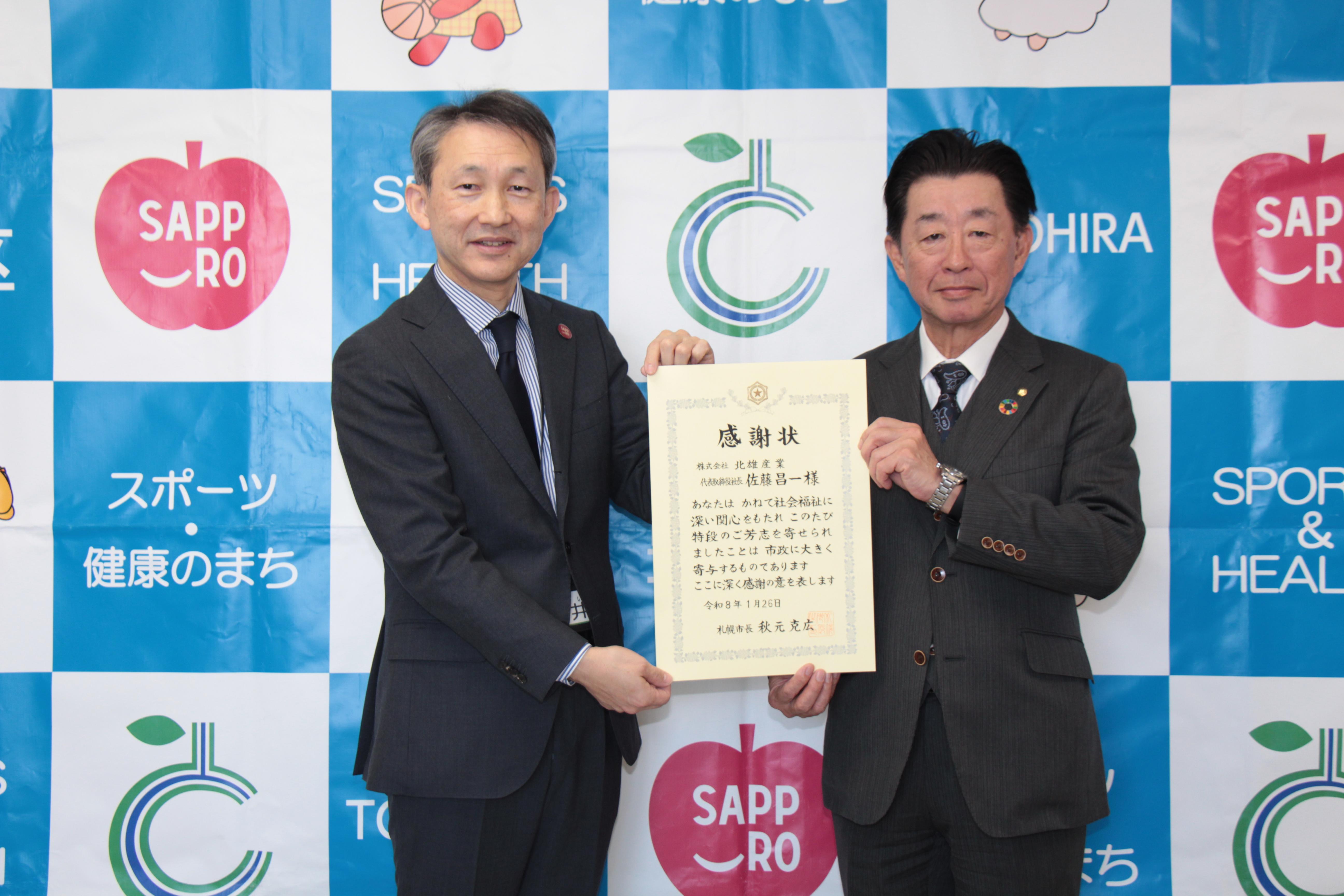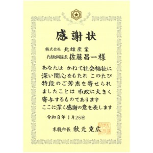 このたび当社社長の佐藤昌一が「豊平区内の母子家庭のために」と図書カードを寄付したことに対し、札幌市から感謝状をいただきました。